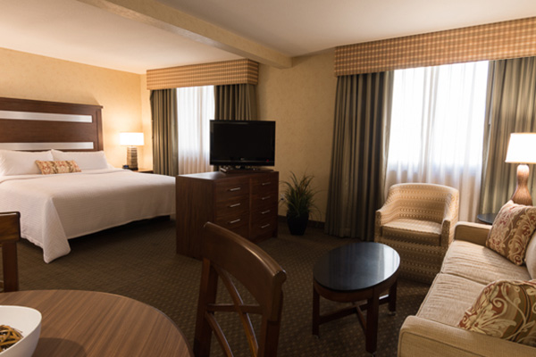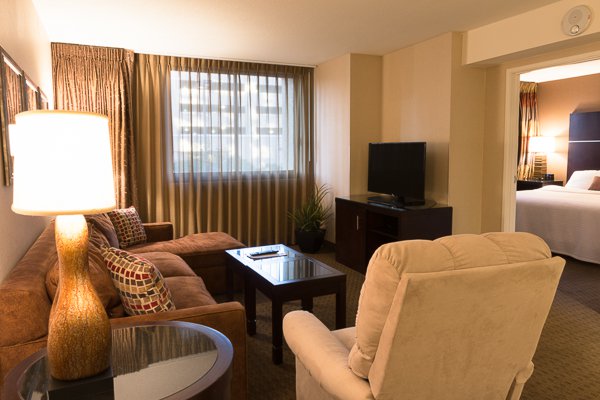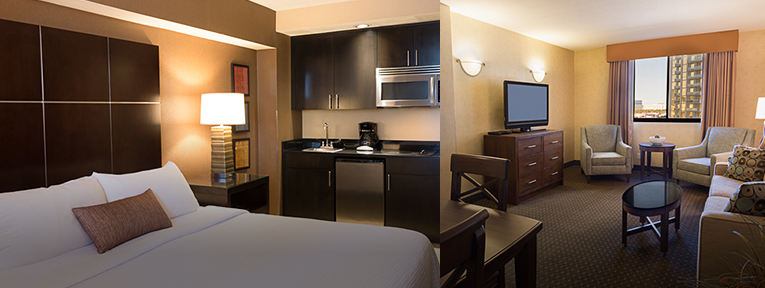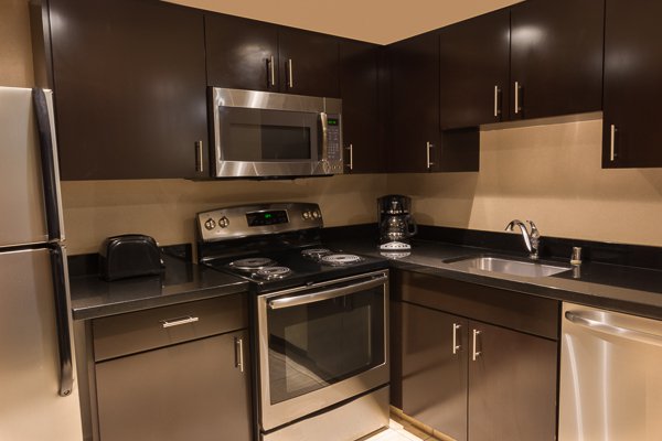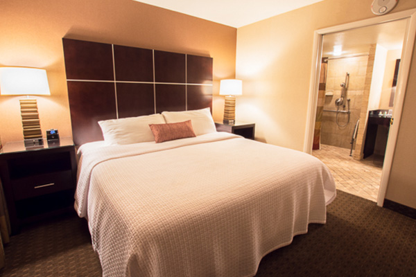ADA 1Bedrm Suite w-kitchen-queen in bedrm-queen sofa bed in living rm-non smoking The 1BR ADA Suite has a queen bed in the bedroom & one queen sofa bed in the living room. Communication and Notification devices are available. The bathroom has an accessible tub. There is a fully equipped kitchen with refrigerator, stove, oven, microwave & coffee maker with complimentary coffee provided daily. Cookware, dinnerware, flatware, towels & utensils are provided in each kitchenette. In room amenities include complimentary Wi-Fi, remote DirectTV, a full size ironing board and iron, and complimentary safe. Non-smoking rooms only.