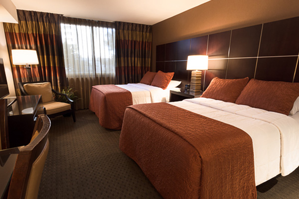 2 Double Beds- kitchenette- complimentary internet and in room safe-non smoking rooms only The Deluxe Guest room has 2 double beds and a fully equipped kitchenette w/small refrigerator, microwave & coffee maker with complimentary coffee provided daily. Cookware, dinnerware, flatware, towels & utensils are provided in each kitchenette. In room amenities include complimentary Wi-Fi, remote cable TV, pay-per-view movies, a full size ironing board and iron, and complimentary safe. These rooms are non-smoking only.